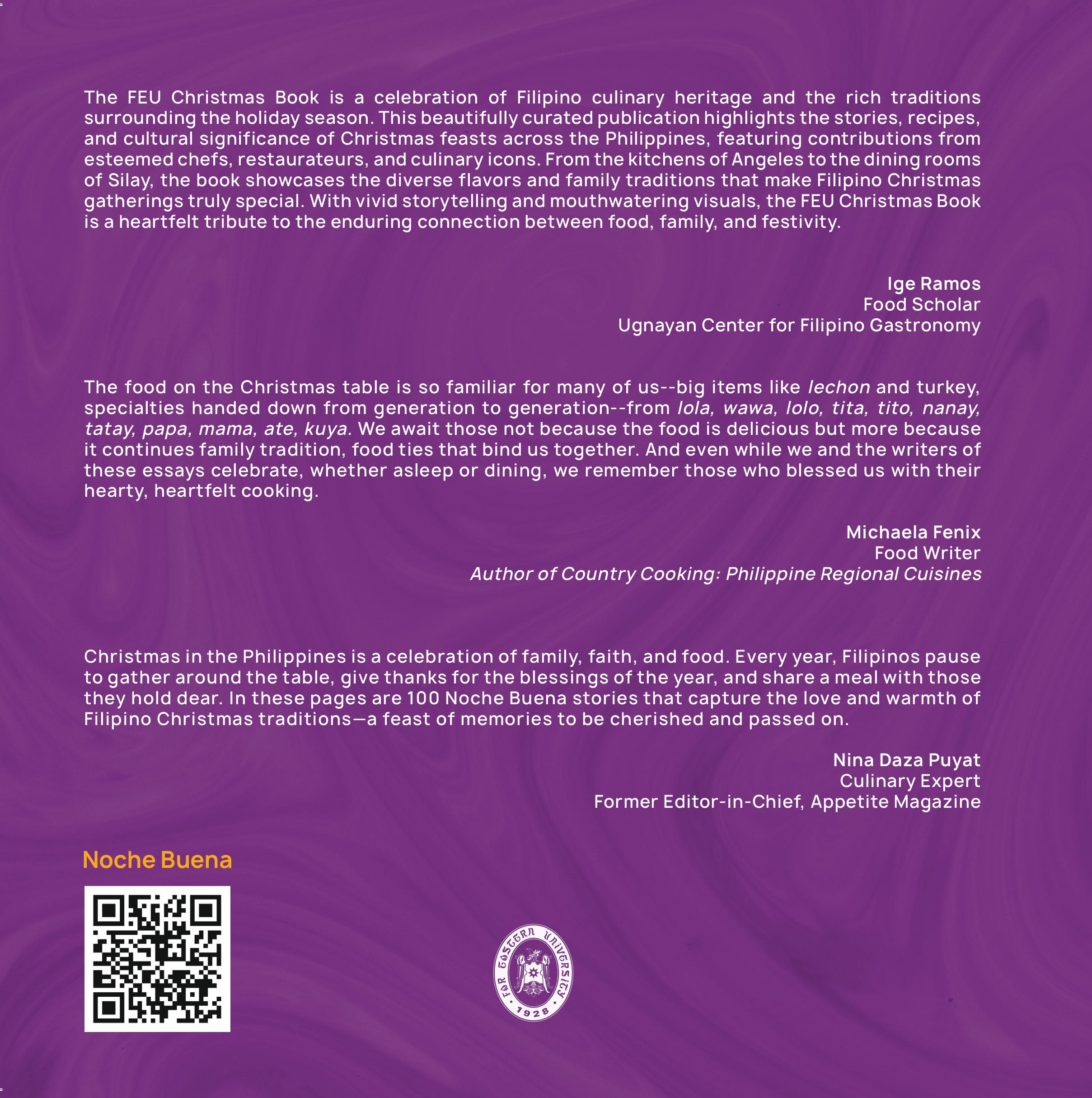Noche Buena is the first title in FEU’s centennial book series. This mini coffee-table book gathers one hundred personal recollections of Christmas memories, traditions, and authentic stories from chefs, restaurant owners, food producers, and writers across the Philippines.