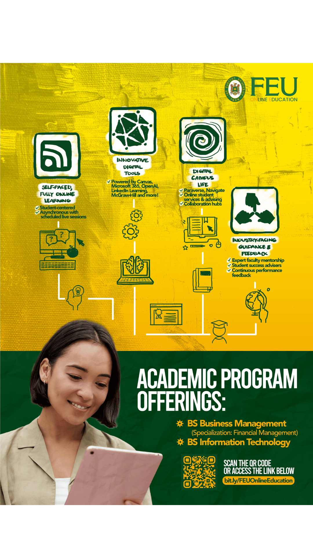 As a prime mover in Canvas-enabled learning in the Philippines, FEU ONE combines a globally recognized learning platform with a students-first philosophy. We bring quality education into your life on your terms. Learn at your own pace, on any device, guided by course conveners who connect every lesson to real-world practice.